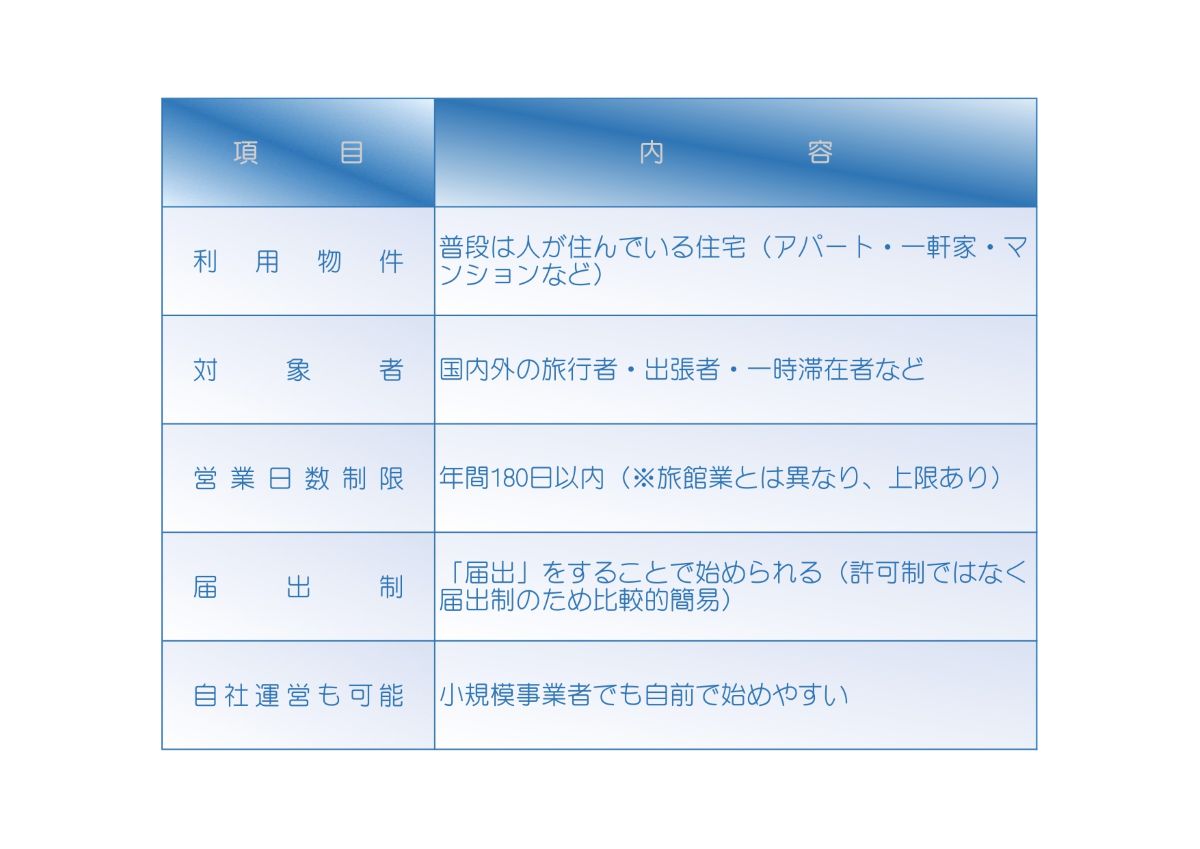 住宅宿泊事業の特徴をまとめると上記のような感じになります。