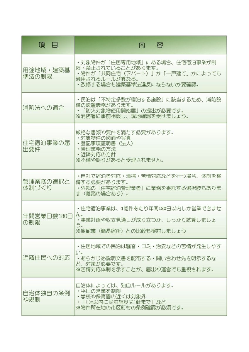 この表は、住宅宿泊事業(民泊)を行う際の主な法的・運営上の留意点をまとめたもので、