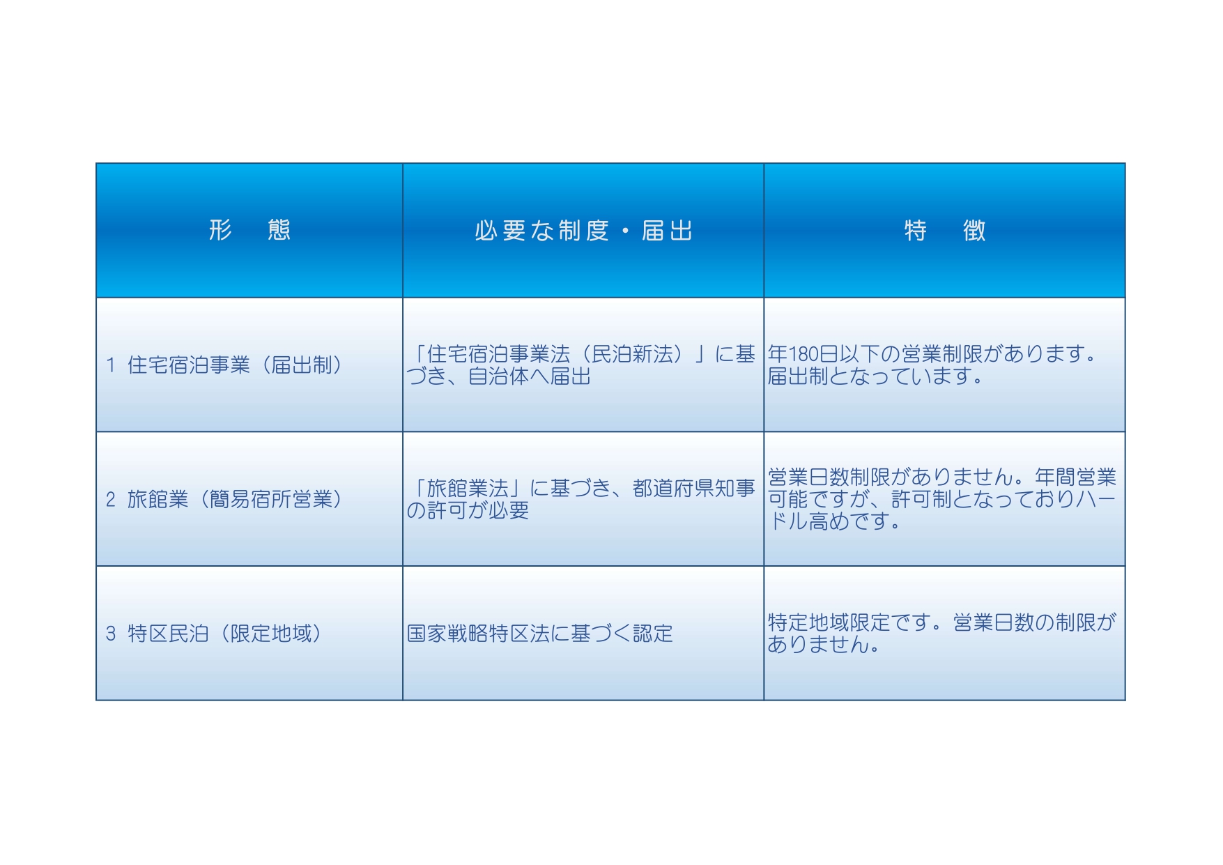 住宅宿泊事業(民泊新法)と旅館業(簡易宿所)の2パターンに分かれます。