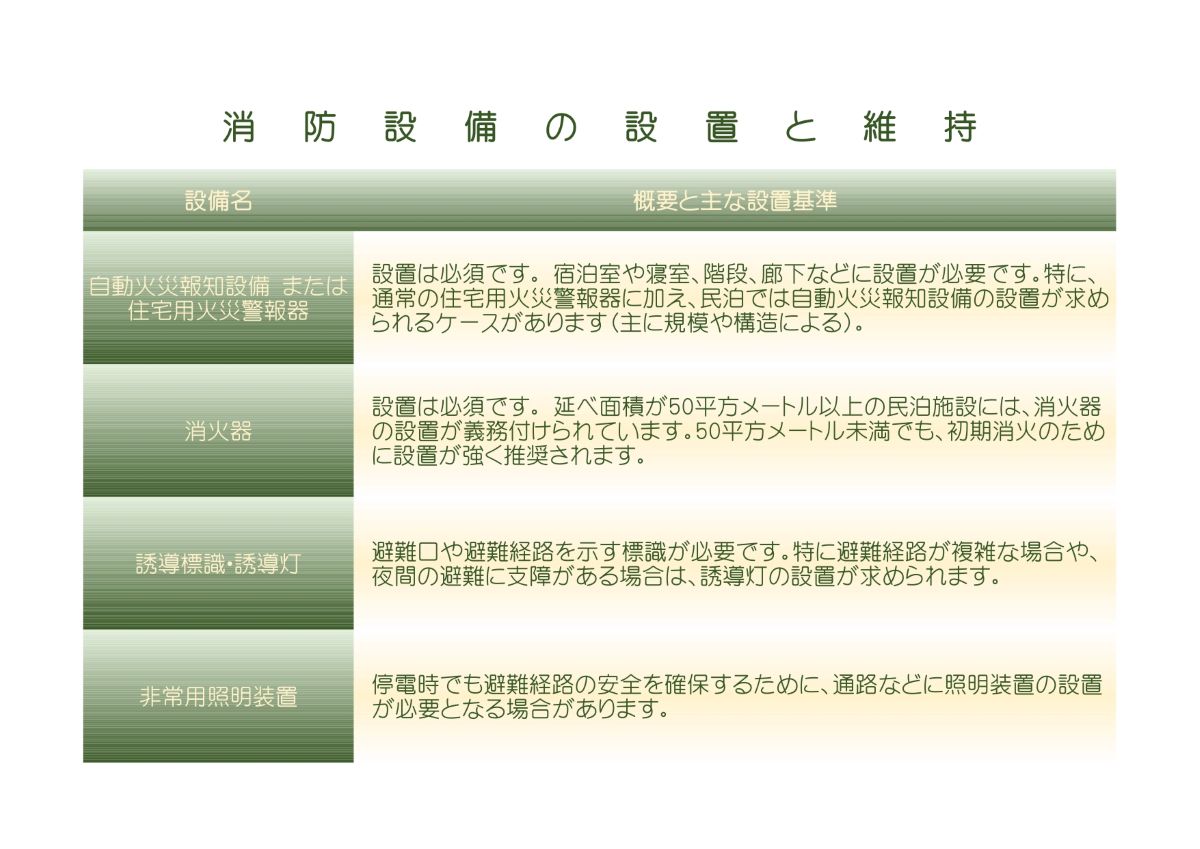 民泊として使用する住宅が消防法および関連法令で定められた安全基準を全て満たしている、