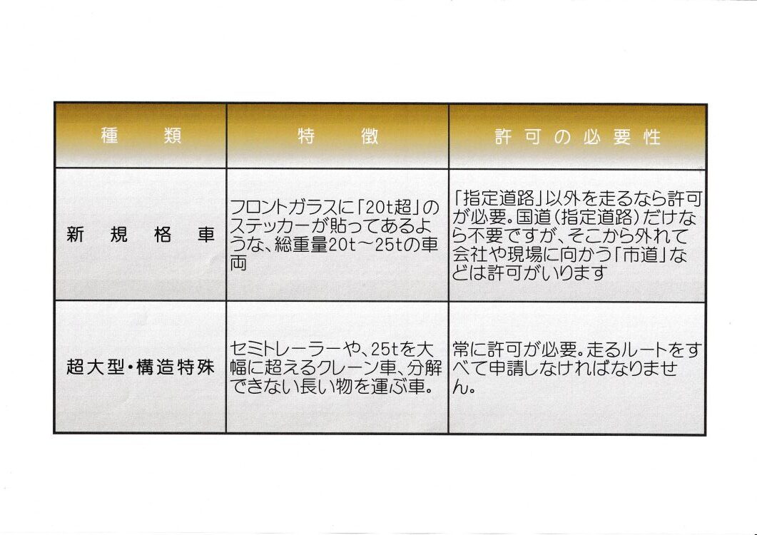 これらは、道路を傷める力が強いため、「丈夫な道(指定道路)以外を通るなら、申請が必要になります。